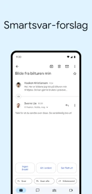 Oppdag en smartere måte å håndtere din digitale korrespondanse på med Gmail, din essensielle følgesvenn for en ryddig og trygg innboks. Gmail fra Google er konstruert for å beskytte deg, der avanserte maskinlæringsmodeller ufortrødent arbeider i kulissene for å avskjære over 99,9 prosent av uønsket søppelpost, lumske forsøk på nettfisking og farlig programvare, lenge før de når ditt digitale dørstokker. Dette gir deg en uforstyrret opplevelse, der du kan fokusere på det som virkelig betyr noe. Med funksjoner som intuitive trådsamtaler og lynraske søk som gir deg øyeblikkelige resultater og staveforslag mens du skriver, er det enklere enn noensinne å finne akkurat den e-posten du trenger.