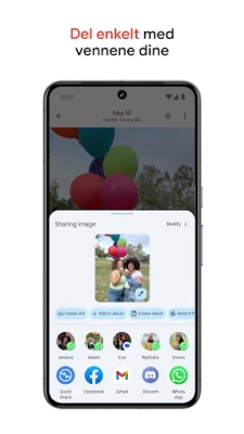 Google Foto er din personlige tidsmaskin, som lar deg gjenoppleve kjære minner og enkelt dele dem med venner og familie, selv om de ikke bruker Google Foto. Med alt innholdet ditt samlet på ett sted, overføres bilder og videoer sømløst fra andre apper og enheter så snart sikkerhetskopiering er aktivert. Og hvorfor la de vakreste øyeblikkene forbli kun digitale? Google Foto gir deg muligheten til å forvandle dine favorittbilder til fysiske minner, fra elegante fotobøker og høykvalitetsbildekopier til imponerende veggkunst, rett fra telefonen din.
