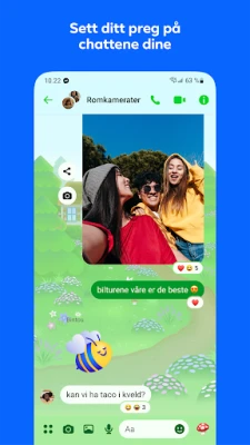 Prioriter personvern med flyktige meldinger som forsvinner etter lesing, og skreddersy levetiden for ende-til-ende-krypterte samtaler. Utover en-til-en-interaksjoner, inviterer Messenger deg til å engasjere deg i meningsfulle fellesskap – enten det er nabolag, skoler eller interessegrupper. Følg favorittskaperne dine tett gjennom eksklusive kringkastingskanaler som leverer autentisk innhold. Uttrykk dine daglige øyeblikk med Stories som forsvinner etter 24 timer, eller del raske tanker i Notater. Gi hver samtale din personlige touch med animerte etiketter, GIF-er, reaksjoner, og velg fra et stadig voksende utvalg av temaer for å matche stemningen i chatten din.